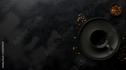 A serene coffee scene featuring a black cup atop a dark surface with scattered coffee beans