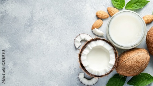 A serene composition featuring almond milk in a glass jar, surrounded by almonds and coconut, with fresh green leaves on a light textured background.