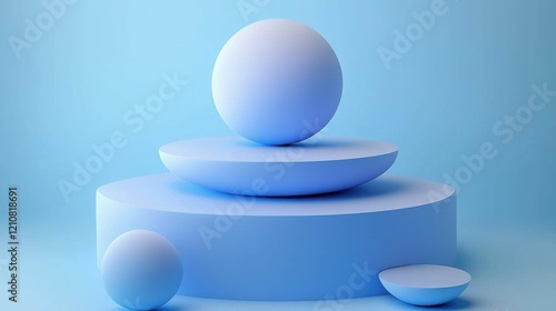 A serene composition featuring three blue spheres arranged on flat circular platforms against a light blue background, creating a minimalist aesthetic.