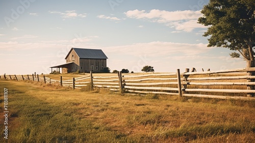 A serene countryside scene with a vintage barn behind a traditional wooden fence on a sunny day.