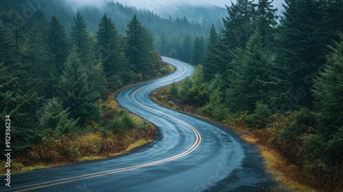 A Serene Curvy Mountain Road Meandering Through a Lush Pine Forest on a Misty Day