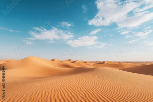 a serene desert landscape with smooth, undulating sand dunes under a clear blue sky dotted with light clouds