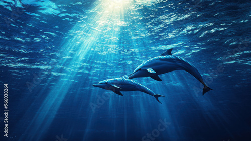 A serene dolphin pod swimming together in the deep blue ocean, with sunlight streaming through.