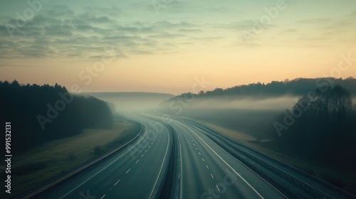 A serene early morning shot of an empty expressway, with mist rising and the sun just beginning to rise, creating a calm atmosphere before the day starts.