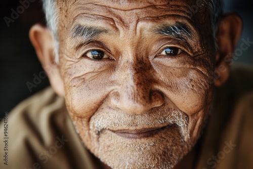 A serene elderly man gazes gently, reflecting years of wisdom and a peaceful demeanor captured in his expressive features. Generative AI