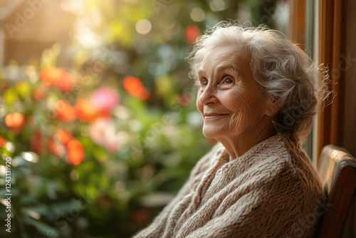 A serene elderly woman, sitting near a window, gazes contentedly at a vibrant garden bathed in sunlight.