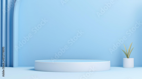 A serene, empty pastel blue podium on a white table, ready to showcase your ideas. Elegant presentation.