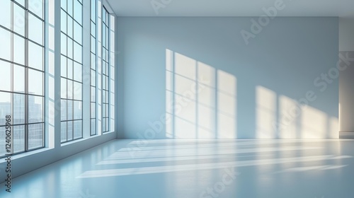 A serene, empty room in a surreal minimalistic style bathed in morning light, copy space, Stock