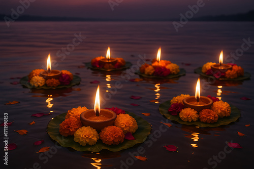 A serene evening view of six diyas floating on a river, surrounded by marigold and rose petals for a ganges puja offering, happy diwali