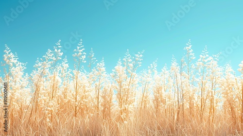 A serene field of tall wheat under a clear blue sky, perfect for use in nature-related projects, backgrounds, and promotional materials for agricultural or outdoor activities,