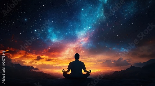 A serene figure meditating under a starry sky, surrounded by vibrant colors of the cosmos, representing peace and enlightenment.