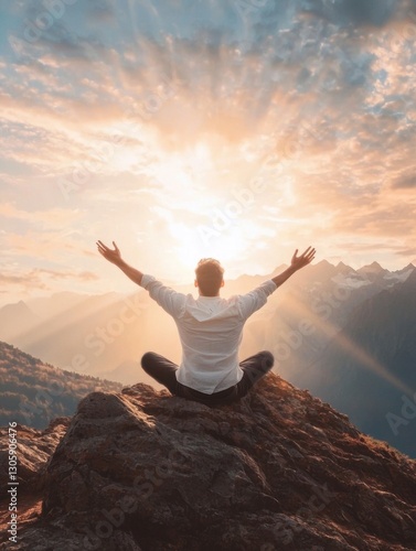 A serene figure sits on a mountain peak, arms raised in joy, as sunlight breaks through clouds, illuminating the breathtaking landscape.