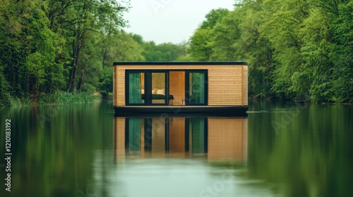 A serene floating cabin surrounded by greenery, reflecting beautifully on the calm water surface.