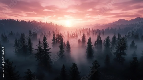 A serene forest landscape at dawn, shrouded in mist with soft pink and purple hues illuminating the sky.
