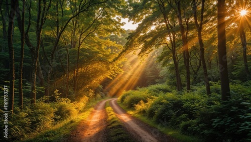 A serene forest path bathed in golden sunlight, surrounded by lush greenery, creating a peaceful and inviting atmosphere.