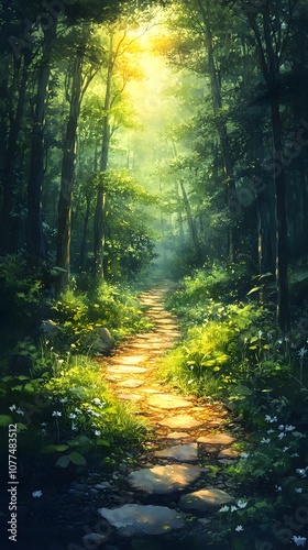 A serene forest path illuminated by soft sunlight, inviting exploration and tranquility.
