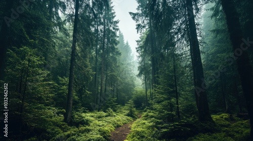 A serene forest path surrounded by tall, mist-shrouded trees and dense green foliage, depicting a tranquil and lush woodland landscape.