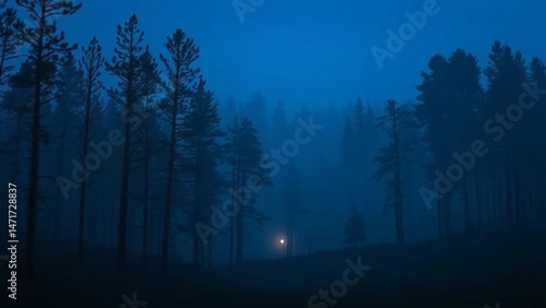 A serene forest scene during blue hour, deep blue dominating the landscape, faint mist among the trees, soft light filtering through the fog, stillness and mystery in the air.