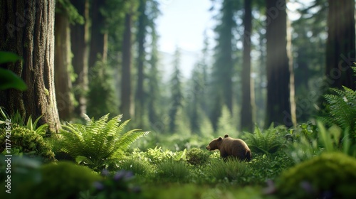 A serene forest scene featuring a bear among lush greenery.