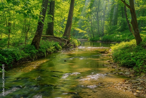 A serene forest scene featuring a gently flowing river surrounded by lush greenery.