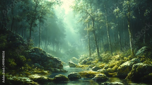 A serene forest scene with a winding river flowing through the trees. The sunlight filters through the leaves, casting a soft glow on the landscape.