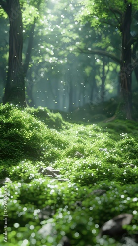 A serene forest scene with lush greenery and soft light filtering through trees.