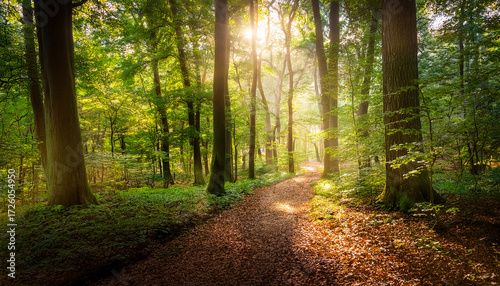 A Serene Forest Scene With Sunlight Filtering Through Tall Trees Casting A Warm Glow On A Winding Path The Ground Is Covered With Lush Greenery And Fallen Leaves Creating A Tranquil Atmosphere