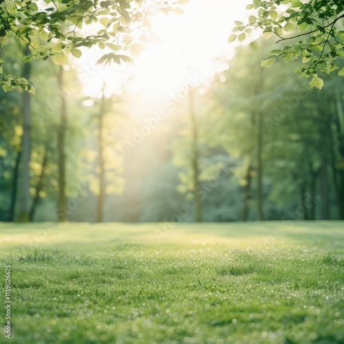 A serene forest scene with sunlight filtering through trees, illuminating a grassy area, evoking a sense of peace and tranquility.