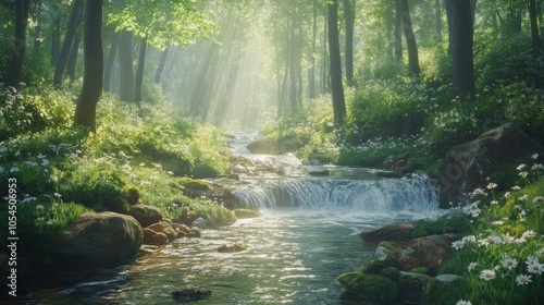 A serene forest stream flows through a lush green forest with sunlight filtering through the trees, creating a magical atmosphere.
