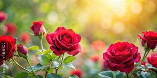 A serene garden scene with a profusion of vibrant red roses blooming against a soft, creamy background, evoking feelings of elegance and refinement , natural, nature