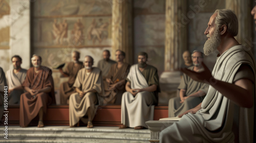 A serene gathering of ancient philosophers in a grand marble hall, engaged in thoughtful discussion under soft light.