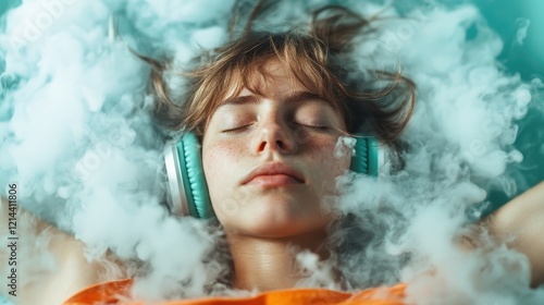 A serene girl with headphones resting peacefully amid wispy smoke, embodying tranquility and a deep connection to music in an ethereal atmosphere.