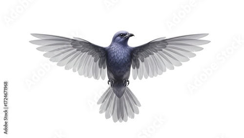 A serene gray bird captured in mid-flight, its wings spread wide against a pristine white backdrop, embodying freedom and tranquility