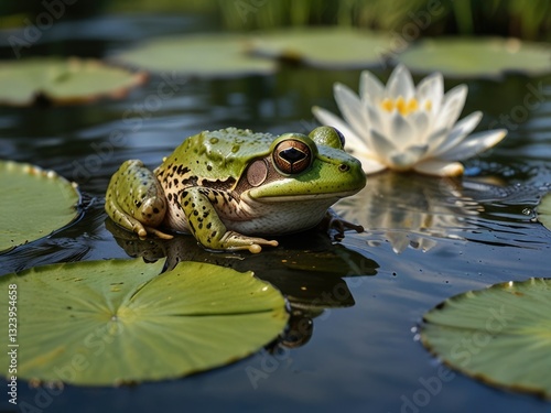 A Serene Green Frog Basking On A Lily Pad In A Tranquil Pond, Surrounded By Lush Water Lilies And A Delicate White Water Lily, Bathed In Soft Sunlight
