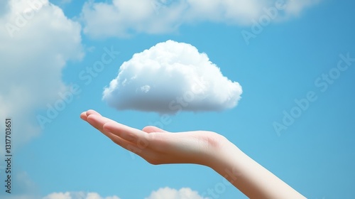 A serene hand holding a fluffy cloud against a bright blue sky, symbolizing dreams and aspirations
