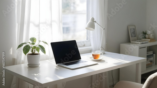 A serene, high-resolution photo of a minimalist home workspace setup with a modern laptop, a cup of tea, a potted plant, and natural sunlight coming through white curtains. Clean white desk, no people
