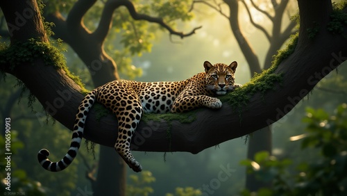 A serene image of a leopard perched in a tree, highlighting its agility and ability to adapt to both arboreal and terrestrial environments.
