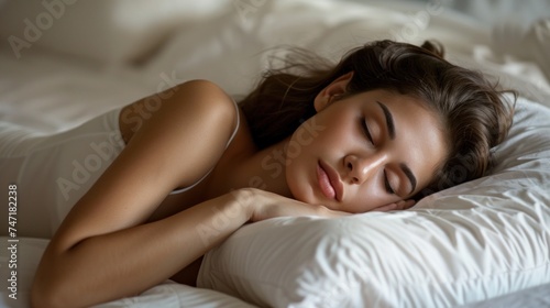 A serene image of a woman in a white tank top peacefully sleeping on a white bed with her head resting on a pillow her hair spread out and her eyes closed exuding a sense of tranquility and comfort.