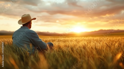 A serene image showing a lone cowboy sitting in a golden wheat field at sunset, capturing a moment of reflection and tranquility in nature's beautiful landscape.