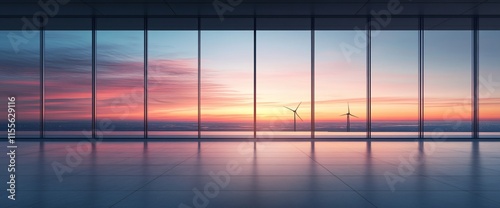 A serene interior view showcasing a sunset with wind turbines in the background.