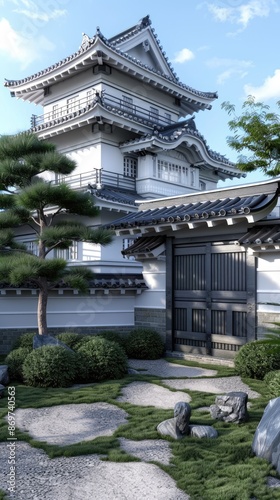 A serene Japanese garden courtyard with lush greenery, stone pathways, and towering pine trees