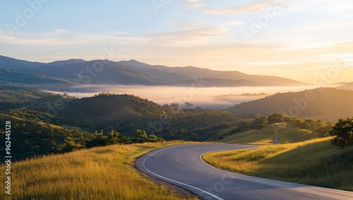 A Serene Journey Through Nature: Exploring the Beautiful Curved Road Embraced by Lush Greenery and Misty Mountains Under a Golden Sunset Sky