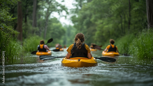 A serene kayaking experience through lush greenery, showcasing adventure and nature's beauty on a calm waterway.
