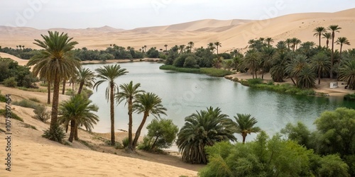A serene lake in the middle of a vast desert oasis surrounded by towering palm trees and lush greenery, tranquility, lake