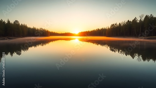 A serene lake mirroring golden sunset and forest, creating a perfectly symmetrical dreamscape.