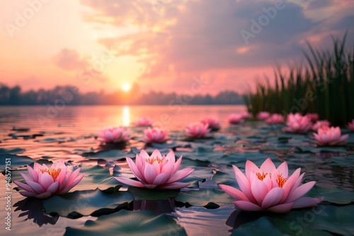 A serene lake scene with beautiful pink water lilies and green leaves. The sun sets softly, casting a warm glow over the tranquil water. Ideal for nature lovers. Generative AI