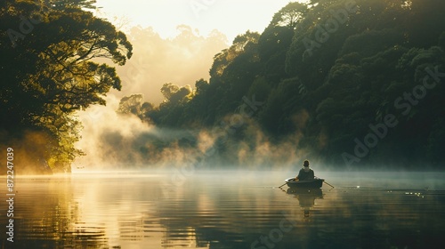 A serene lakeside scene at dawn, with mist rising from the water and a lone fisherman patiently waiting for a catch, surrounded by lush greenery