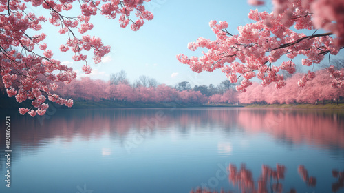 A serene lakeside view with cherry blossoms reflecting on the water surface under a clear sky