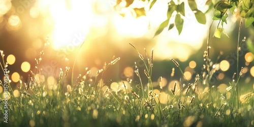A serene landscape capturing the essence of Easter morning, with soft sunlight filtering through green leaves, illuminating a vibrant meadow filled with blooming flowers and fresh grass.
