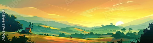 A serene landscape depicting rolling hills under a vibrant sunset, perfect for conveying tranquility and natural beauty.